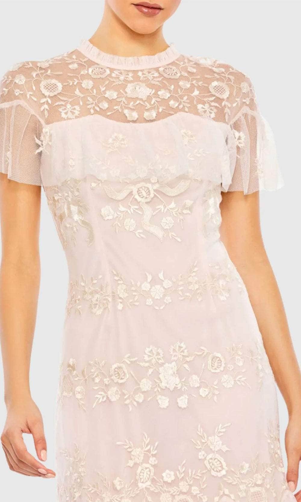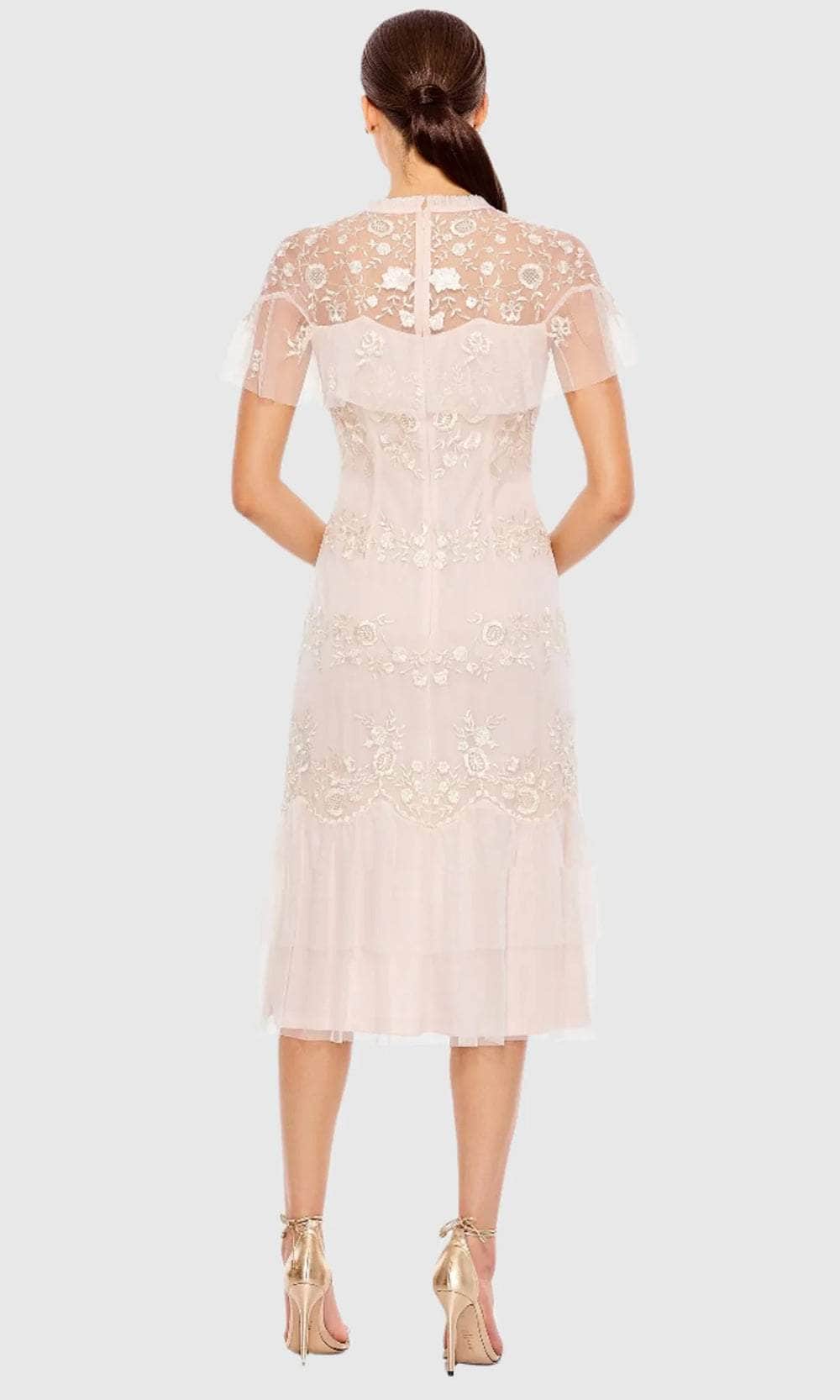 Step out looking vibrant and pretty in this Mac Duggal 35147 masterpiece. This dress is decorated with flowery embroidery that will catch the crowd attention and has a timeless beauty. With its subtle allure from the illusion yoke, it features a high neckline, short sleeves, and a full back. The ruffled design on the top brings a fun touch. The skirt displays a sheath silhouette with dramatic tiered detailing and it ends in a tea length hem. This Mac Duggal 35147 dress is a attention-grabbing choice for any festivities. Model is wearing Blush color.