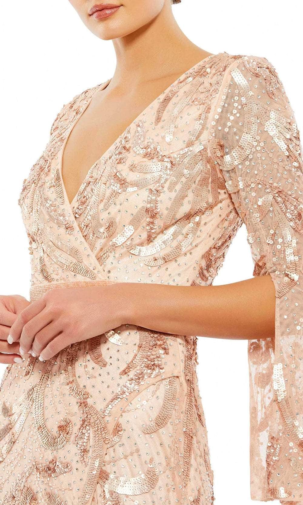 Embrace red carpet glamour in this stunning Mac Duggal 5222 gown. Adorned from head to toe with sparkling sequins and beadwork, this breathtaking dress features a faux wrap V-neckline, split long sleeves, and a closed back. The natural waist is beautifully accentuated by a beaded waistband, while the sheath skirt showcases a high slit before flowing into a full-length hem and sweeping train. Captivate the crowd with your sophisticated style in this exquisite Mac Duggal 5222 creation. Models are wearing the Platinum, and Rose Gold colors.