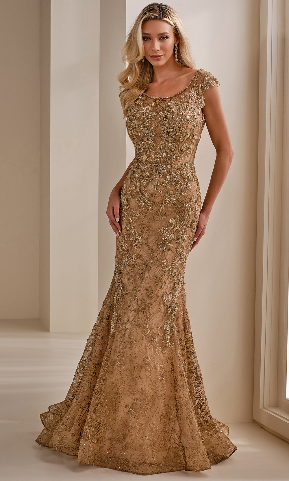 Let your style shine in a Montage by Mon Cheri M3109 gown that combines classic romance with a fresh silhouette. It features a scoop neckline, cap sleeves, detachable long bishop sleeves, and a body-hugging fit that flows into a mermaid skirt. Allover lace adorned with sequins and beaded creates a rich texture, while the natural waistline defines the figure gracefully. A soft sweep train finishes the look with grace. For those seeking elegance with impact, the Montage by Mon Cheri M3109 gown delivers a truly unforgettable presence. Models are wearing Navy, Antique Gold, and Rose colors.