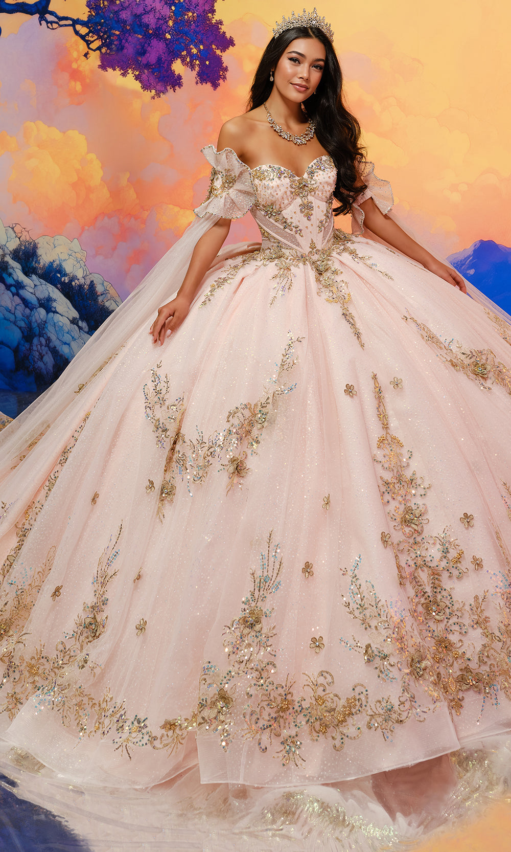 Step into a world of shimmer and grace with the enchanting Princesa by Ariana Vara PR30208. The sweetheart neckline flows into delicately long cape sleeves, framing a corset bodice rich with beadwork and floral lace appliques. The voluminous skirt sparkles from top to hem, creating a princess silhouette that glistens with movement. Dimensional florals and soft details define the look, adding texture and femininity. Radiating romance and charm, the Princesa by Ariana Vara PR30208 is made for those who dream in glitter and elegance. Models are wearing Slate, and Blush/Gold colors.