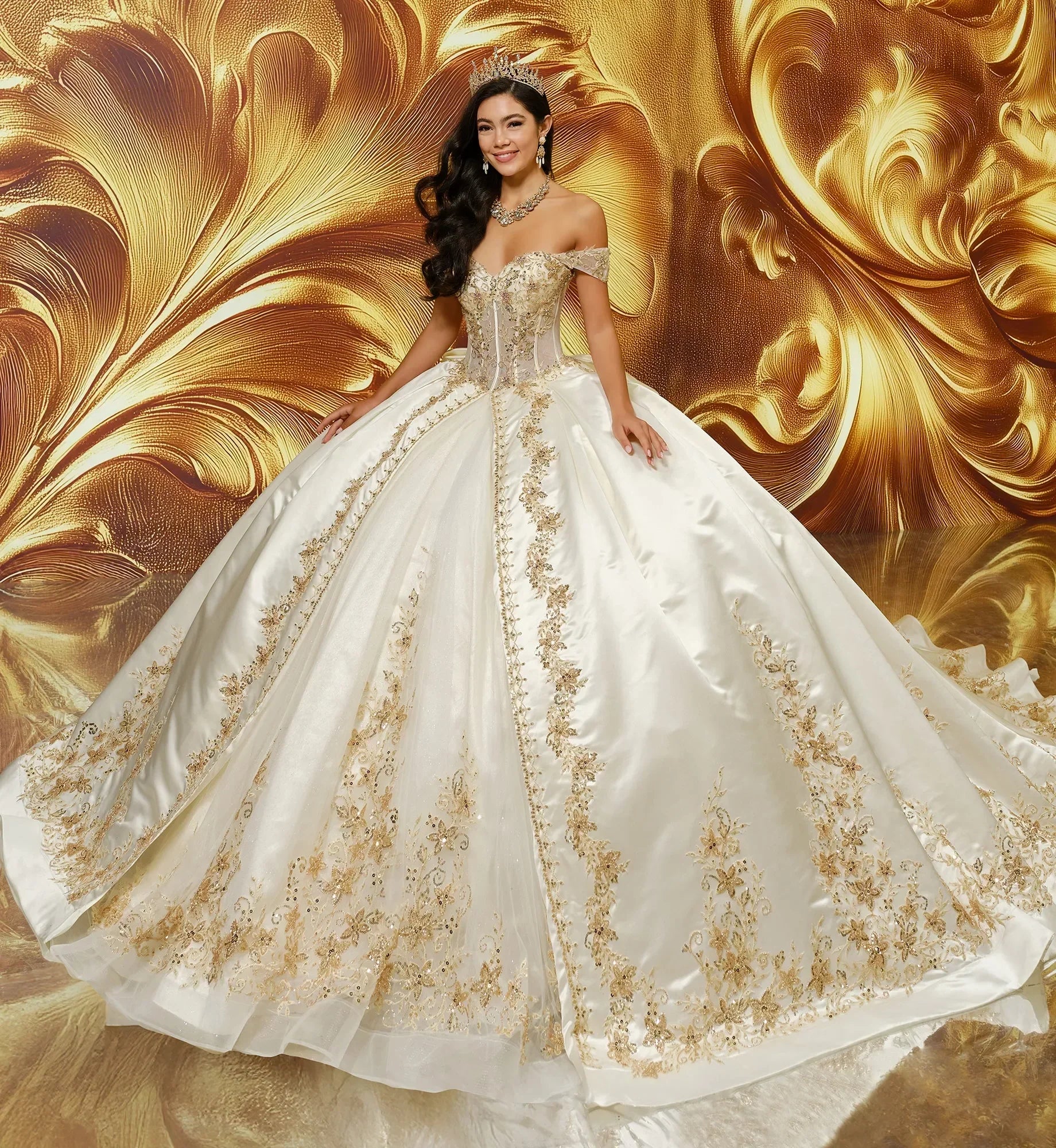 Command the room in the resplendent Princesa by Ariana Vara PR30210. Featuring a strapless sweetheart neckline and gracefully corset jacket, this gown marries tradition with luxurious detail. The sheer corset-style bodice is beautifully embroidered and flows into a layered ballgown skirt enriched with floral lacework. The soft sheen of satin adds sophistication, while the ornate trims create visual harmony. With its timeless appeal and exceptional craftsmanship, the Princesa by Ariana Vara PR30210 defines princess glamour with a regal twist. Models are wearing Ivory/Gold, and Petal colors.