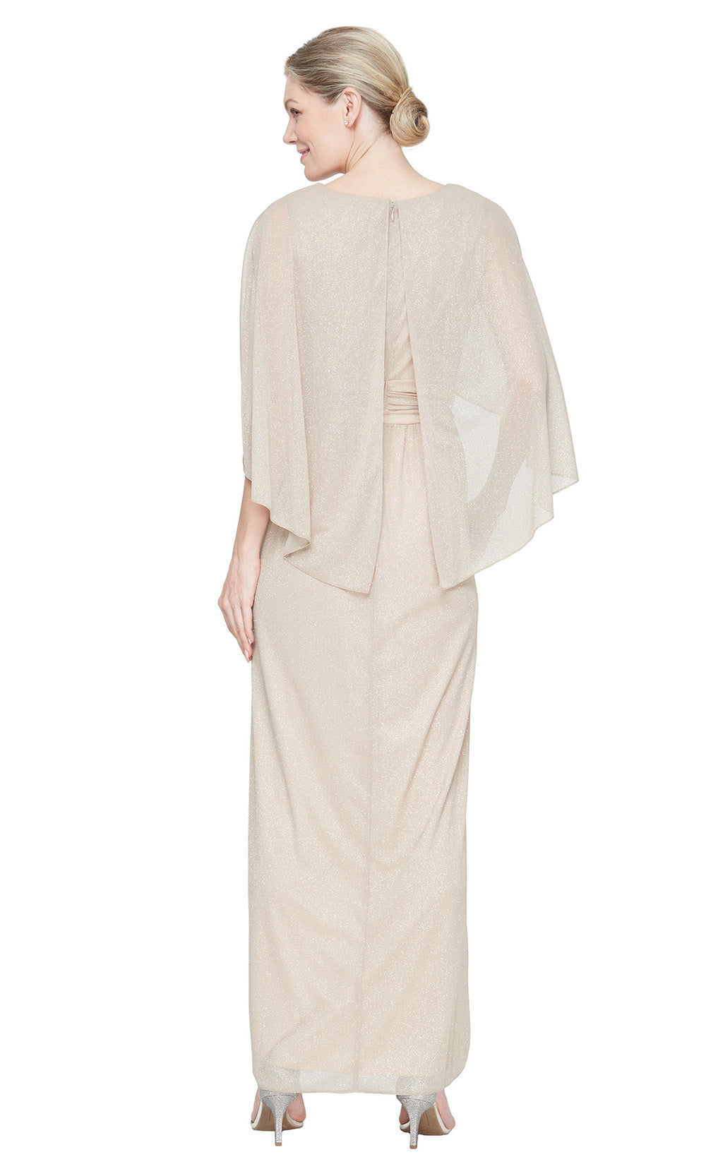 | Details: | Beaded Accent, Ruched Waistband, Capelet Sleeves, Full Back, Concealed Back Zipper |