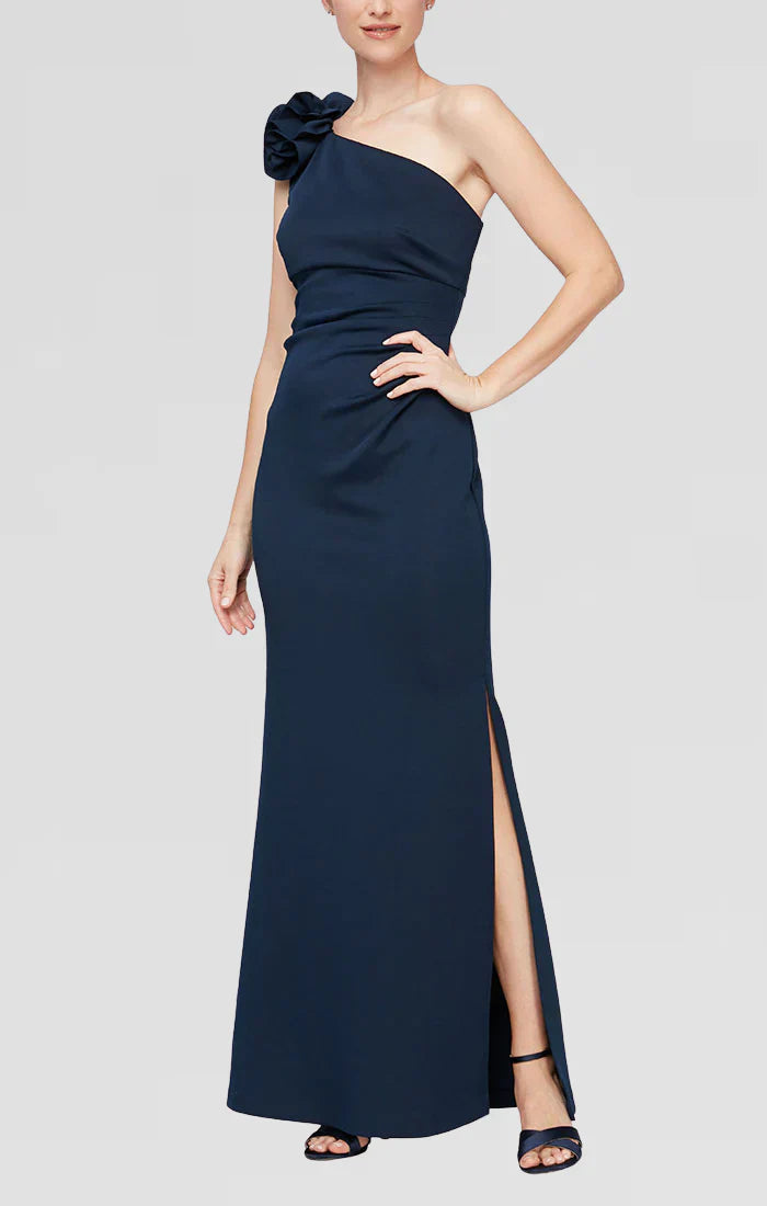 Elevate your evening look with the S.L. Fashions 9134208. Designed with a one-shoulder neckline adorned by a bold 3D floral accent, this dress exudes elegance. The ruched bodice highlights your curves, while the high slit in the skirt brings alluring flair. Crafted from stretch fabric, it hugs your figure while ensuring comfort. Simple yet striking, the S.L. Fashions 9134208 is a versatile choice for special nights where sophistication is a must.