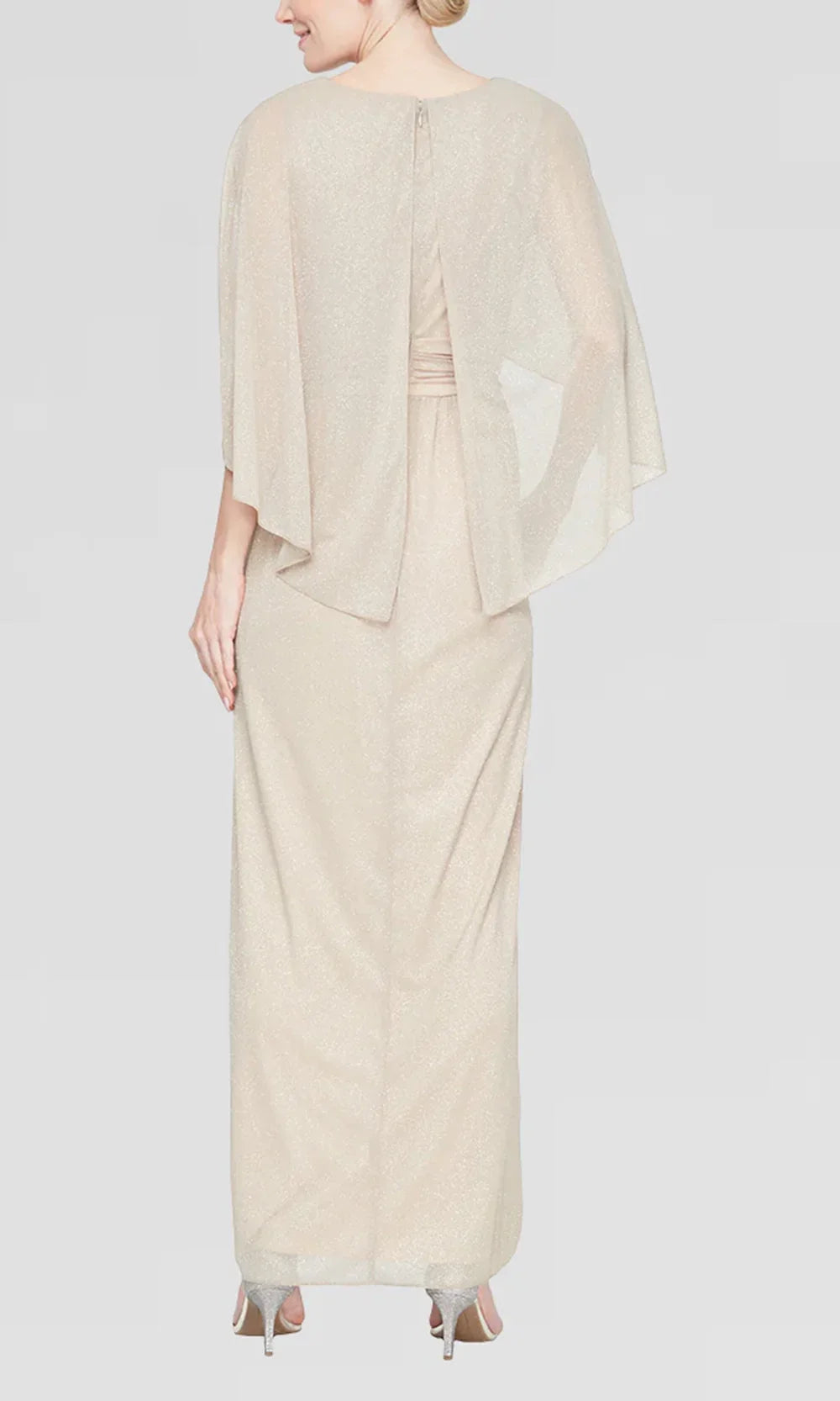 Radiating understated elegance, S.L. Fashions 9233253 blends delicate shimmer with graceful tailoring. The softly ruched waistband draws in the natural waist while the capelet sleeves overlay flows gently to the sides offering refined coverage. A jewel neckline accented with beaded embellishment creates a touch of glamour, balanced by the clean A-line silhouette. This long gown moves effortlessly and flatters with every step. Choose S.L. Fashions 9233253 for a polished look that brings effortless charm to any sophisticated evening event. Model is wearing Champagne color.