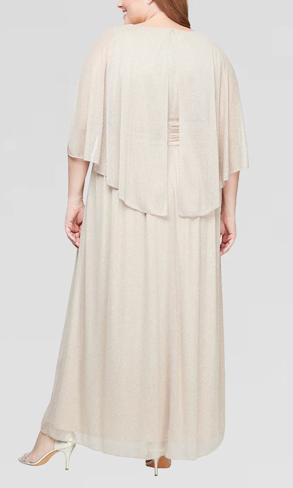 Distinctive accents and a flowing silhouette define the appeal of S.L. Fashions 9433253. A jewel neckline adorned with soft shimmer sets the tone for this sophisticated dress, complemented by airy capelet sleeves that float over the arms. The wide ruched waistband offers a flattering contour without compromising ease. Its full-length hemline and A-line skirt finishes the design with a sense of graceful simplicity. For an elevated wardrobe option that blends delicate detailing with classic shaping, S.L. Fashions 9433253 stands out with enduring elegance. Model is wearing Champagne color.