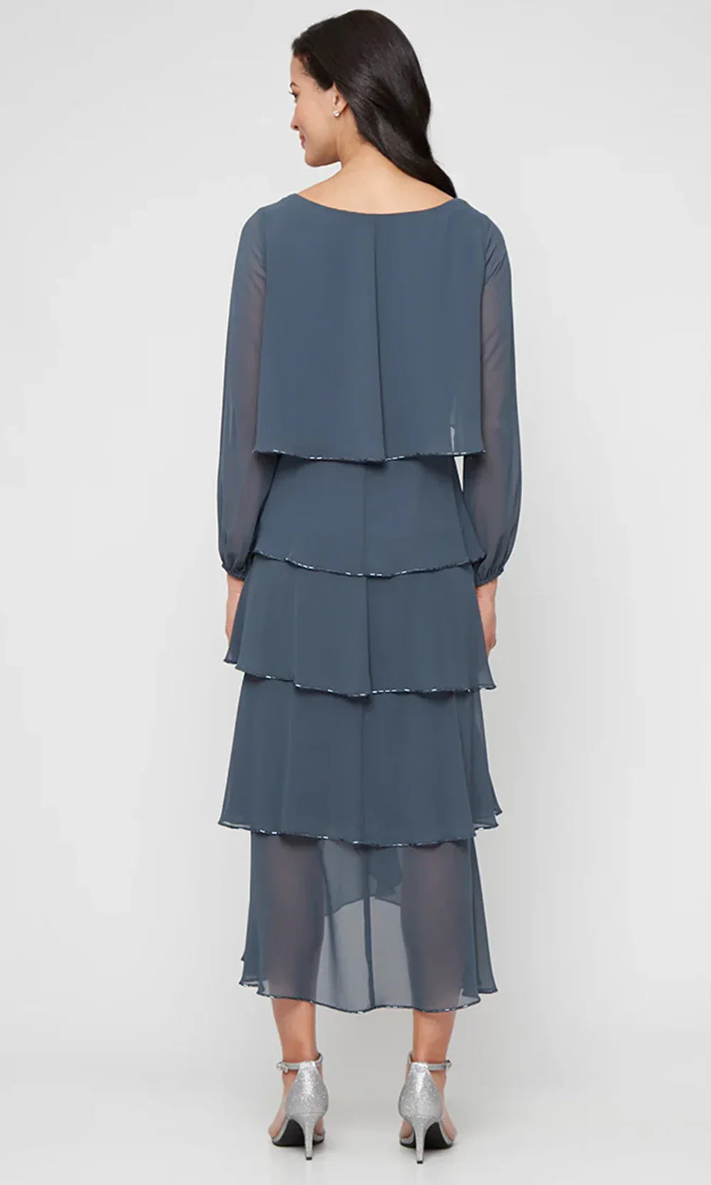 S.L. Fashions 9470731 combines airy layering with sparkle accents for a look that is as dynamic as it is elegant. A scoop neckline leads the way, while the fully covered back brings structure and poise. Diagonal ruffle tiered cascade down the dress, creating visual texture and soft volume. The sheer long bishop sleeves and lightweight construction ensure comfort without sacrificing style. Delicate bugle beads along each edge offers a refined touch of shimmer. With S.L. Fashions 9470731, enjoy a statement piece that delivers flowing beauty and subtle shine in perfect balance. Dress is shown in Missy size for reference. Model is wearing Slate color.