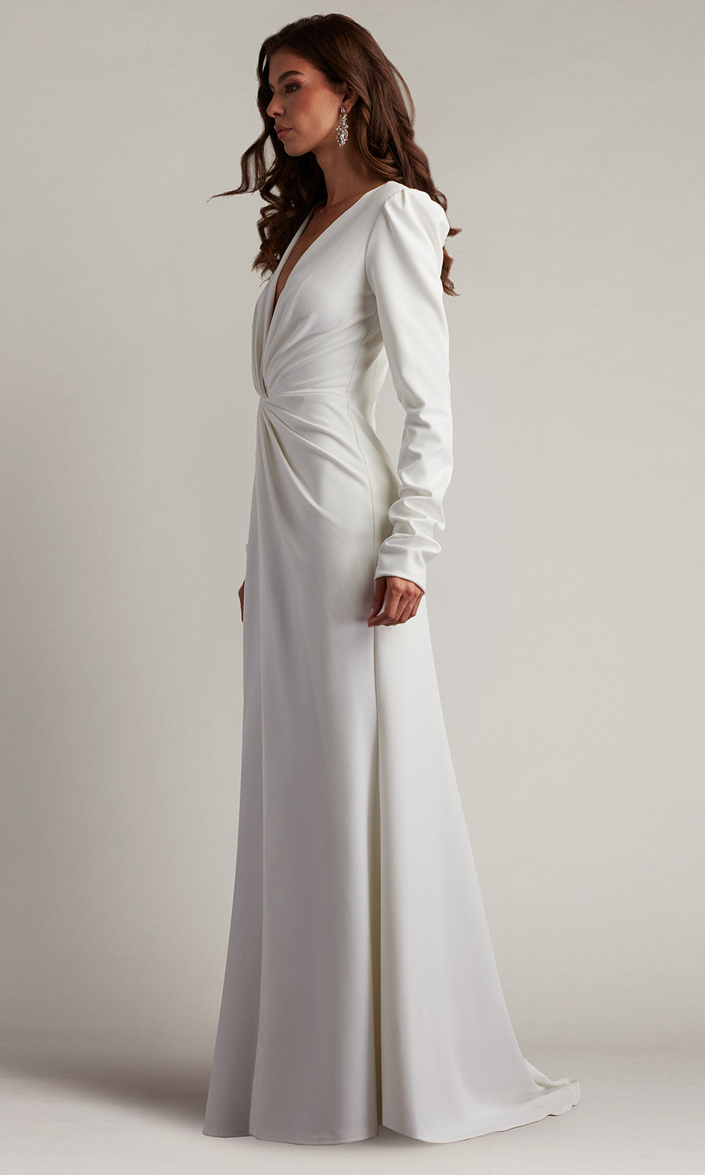 Chic minimalism defines the Tadashi Shoji BOS21138LBR, a gown that embraces refined detailing and a flattering silhouette. The plunging V-neckline introduces a contemporary edge, offset by the demure coverage of long sleeves. Its twist knotted waist draws the eye inward, enhancing the natural figure before flowing into a sheath skirt that moves gracefully with each step. A front slit offers a discreet yet impactful touch, while the crepe fabric ensures a polished finish. From its elegant lines to its timeless appeal, the Tadashi Shoji BOS21138LBR is a versatile statement for evening occasions. Model is wearing Ivory color.