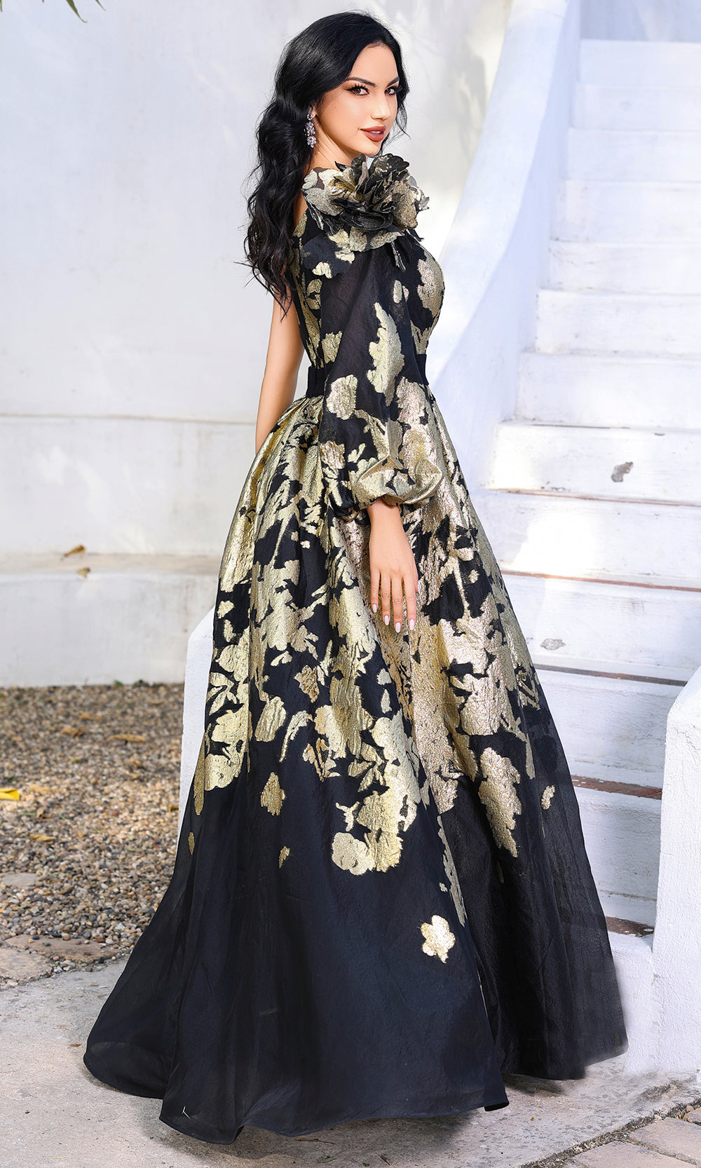 Details: | One Shoulder, Floral Pattern, Long Bishop Sleeve, Oversized Floral Accent, Wide Waistband, Floor Length |